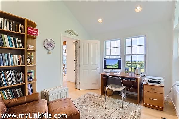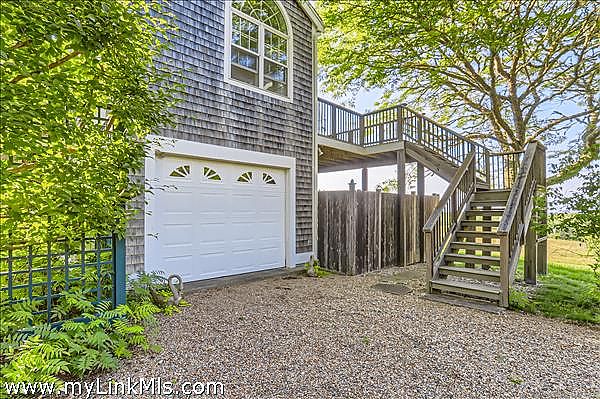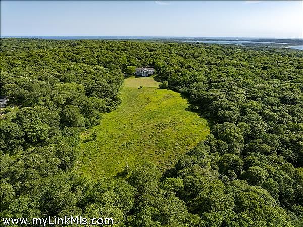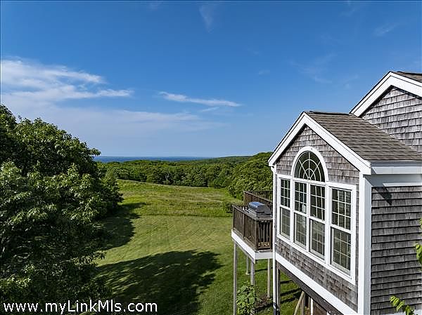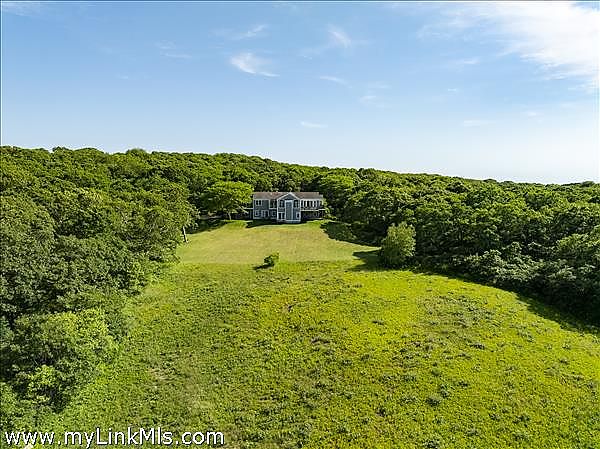 Perched high on the north shore with sweeping views of the Vineyard Sound, this expansive and private property is surrounded by Menemsha Hills conservation land and trails and offers broad water views, even from ground floor of house. The house is large and well maintained with an upside down floor plan allowing for high ceilings and bright spaces in the open plan kitchen/dining/living room, as well as the primary bedroom suite and office on this upper level. This is a great house for entertaining and offers A/C, screened porch, generator, music system, outdoor lighting and other perks. The exterior space features a tennis court, beautiful gardens with water feature, and a cleared meadow, which is several acres in size, surrounded by woodlands. No other houses can be seen from here. A pool is possible and there is plenty of space for this addition. Subdivision potential. Includes Brickyard Beach rights.