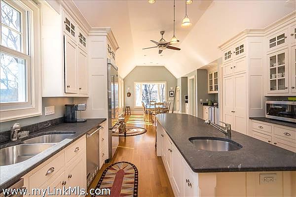 The gourmet kitchen is a dream for cooks and entertainers alike, featuring custom cabinetry, stone countertops, and stainless appliances. An expansive kitchen island and a wet bar with beverage refrigerator and ice maker enhance the entertaining experience. Adjacent, a spacious dining area with custom built-ins is perfect for memorable gatherings.