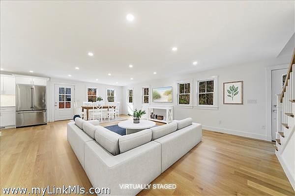 On the doorstep of vibrant Oak Bluffs, discover this exquisitely renovated four bedroom home with separate office or studio space, all ensconced in professionally landscaped grounds. Blending modern comfort with timeless island charm, the house features wide plank white oak floors, beautiful ceiling height and natural light, an open-concept living-dining space with a new kitchen, a first-floor primary bedroom with ensuite bath, powder room, and laundry room. Upstairs are three additional spacious bedrooms and two full baths. A new roof, siding, and central air enhance comfort. Outside, enjoy a large back deck, welcoming front porch, and an expansive yard with irrigation, a new sod lawn, lush evergreen and privet hedge borders, plus a classic Vineyard must-have: an outdoor shower. Ideally located near charming Oak Bluffs with its whimsical gingerbread cottages, Flying Horses Carousel, harborfront, quaint shops, dining, and nearby Oak Bluffs Town and Jetties beaches. Buyers and agents please verify all herein.