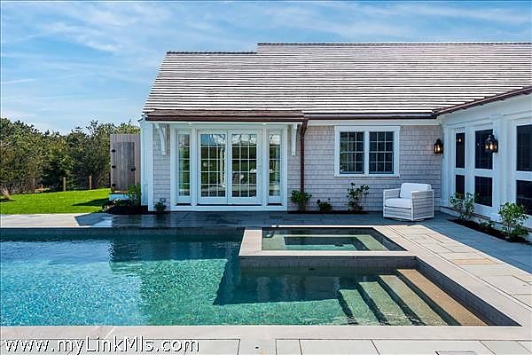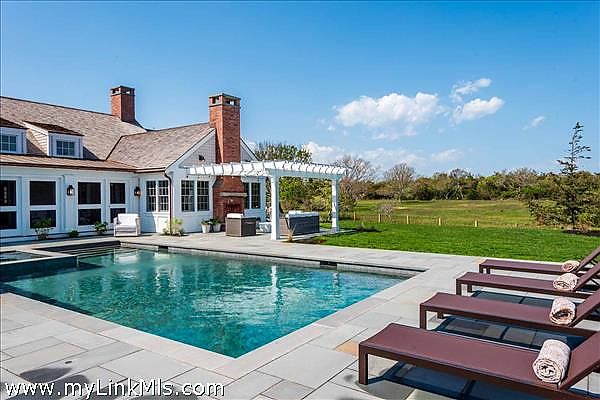 LUXE COASTAL RETREAT IN KATAMA. Sited at the end of a long private drive, amid a bucolic 1.5-acre meadow setting and lush perennial gardens, this elegant coastal retreat, designed by noted architect Patrick Ahearn, offers the epitome of luxurious living in Katama. The home’s timeless and charming character is highlighted by thoughtful, top-notch architectural details and styling throughout. There are vaulted ceilings in every room of the house with custom millwork and paneling, antique rough hewn beams adding charm and character. In addition, the well-designed floor plan features multiple living areas that open out to a central courtyard with bluestone terrace, an outdoor wood-burning fireplace and an 18'x36' gunite swimming pool with built-in whirlpool spa. The property is ideally located near South Beach, with the sounds of the ocean nearby. Furnishings, artwork and accessories are available separately for a turnkey and move-in ready purchase opportunity.