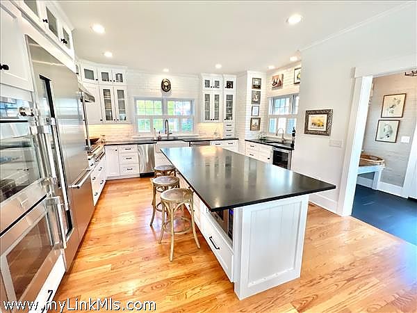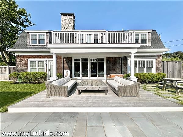 EDGARTOWN - KATAMA - A MUST SEE! Summer living at its best. A wonderful property, a luxury oasis, a retreat & personal playground, situated equidistant between South Beach & Downtown Edgartown, within walking distance to The Field Club. This prestigious location offers a perfect blend of classic Vineyard charm & modern sophistication. Main house features a dramatic, double-height entrance w/immediate view through the house to the pool. Open floor plan incorporates living room w/fireplace, built-ins on either side, coffered ceiling & glass doors leading to a fabulous backyard. Living room & dining room visually defined by a lovely transom window detail. Chef’s kitchen, outfitted with top-of-the-line Thermador Stainless appliances, 6 Burner gas stove, double ovens, large wine cooler, smaller drinks cooler, extra large refrigerator & an oversized soapstone clad center island ideal for entertaining…always in the kitchen at parties! Mudroom w/pantry. Ground floor Primary is a large sun-soaked bedroom w/coffered ceilings, Hessian feature wall & direct access to deck & heated pool. Complete w/walk in closet. Private bathroom w/comfortable soaking tub, glass shower & double vanity. Upstairs to second large living room, w/fireplace, small loft & deck overlooking pool. Two spacious bedrooms, each w/large en-suite bathrooms. Large finished basement w/Media Room, Games Area, bathroom & tons of storage. Detached Guest Suite above two-car garage. Beautifully appointed, offers a private fourth bedroom w/full bathroom, perfect for hosting visitors or providing a separate office or studio space, with deck! Backyard is just wonderful. Step out into a private resort-style oasis. Fabulous 16 x 32 Gunite, heated pool, expansive bluestone patio, multiple lounging areas for sunbathing, sitting & dining Al Fresco. Outdoor kitchen w/counter, bar stools & separate table & chairs, couches, picnic bench. Another patio, designed for conversations around a fire pit! Fully equipped outdoor kitchen, ideal for hosting summer gatherings, plus a mahogany-clad outdoor shower!. Two Car garage. Central A/C, Sonos. Beautifully landscaped yard w/varied plantings and trees, circular driveway & plenty of parking.