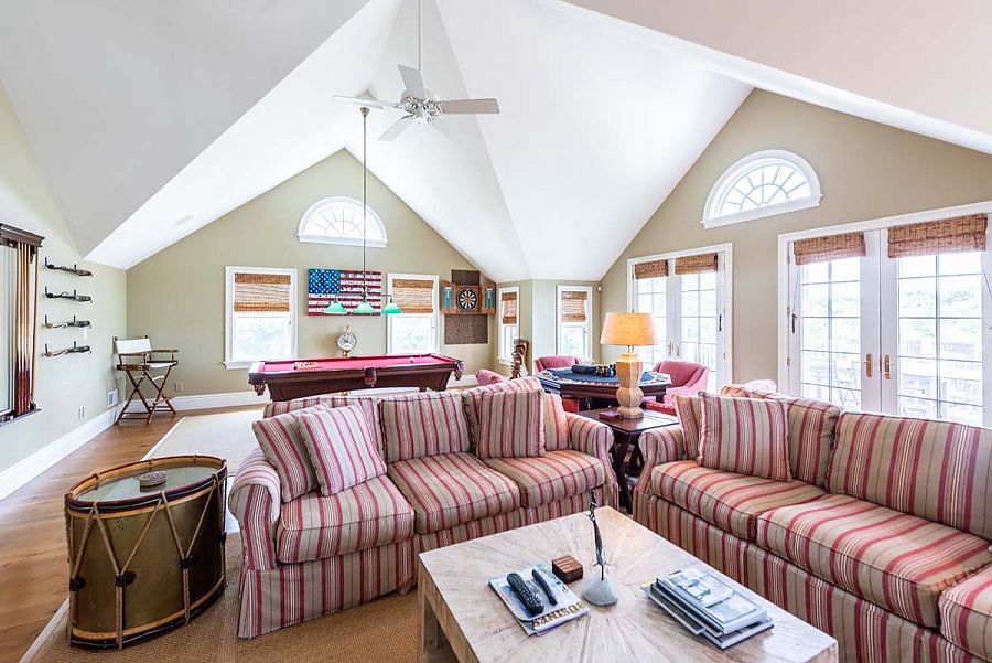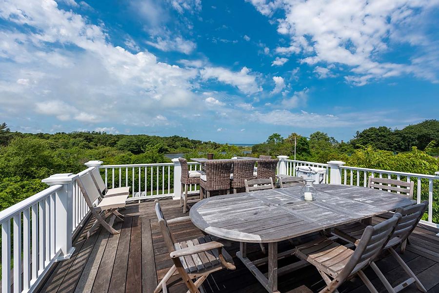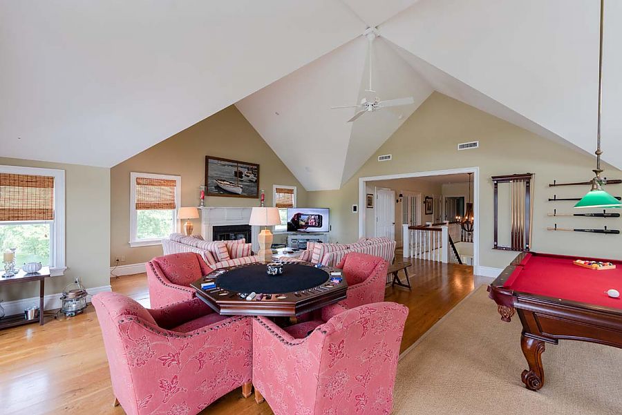The 2nd level features a fabulous large media game room with pool table, sofa seating around the TV area and game table. This area opens via French doors to a spacious 2nd level deck with gorgeous meadow view across Sherriff’s Meadow Conservation land and pretty and expansive distant water views.  There is a bar and table seating for 10 on the deck.  Two additional bedrooms on this level include the Primary Bedroom with a King Bed en suite, and a guest bedroom with two singles also en suite.