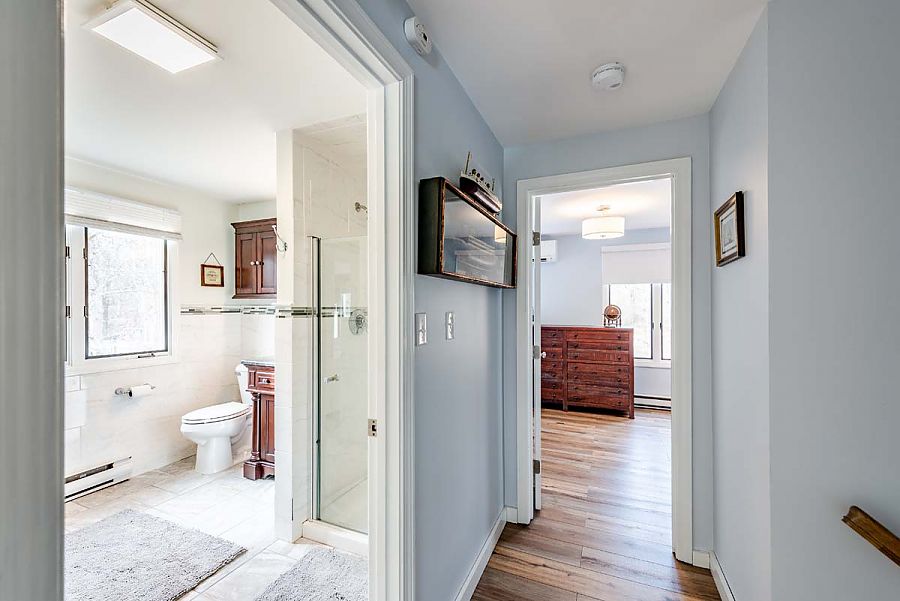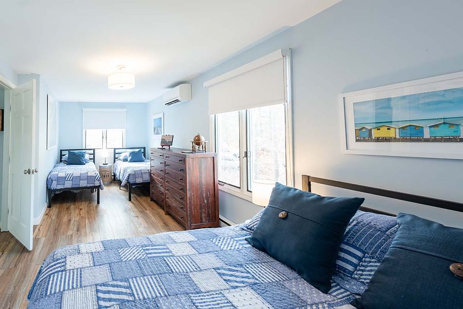 The 2nd level hosts two large bedrooms, a primary with lovely furnishings, a King bed, and a TV. The 2nd bedroom is great for kids with  2 single beds and a queen bed. These two bedrooms share a hall bath but the primary has direct access from within the bedroom as well.