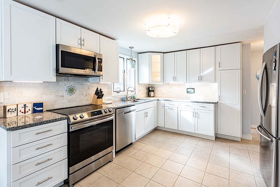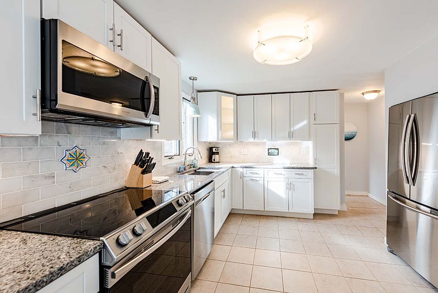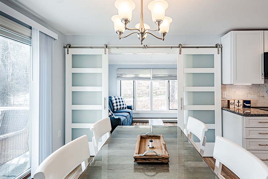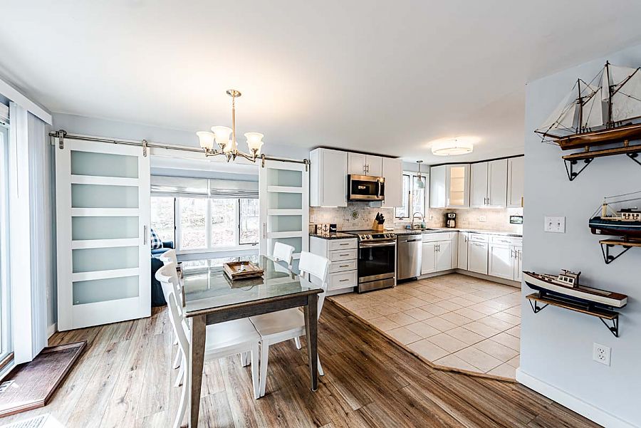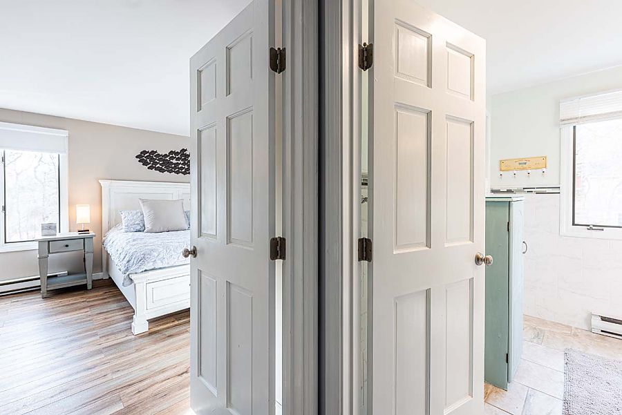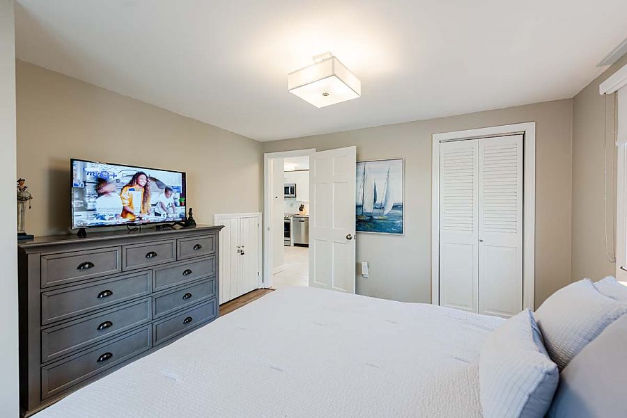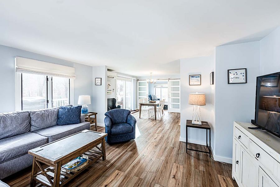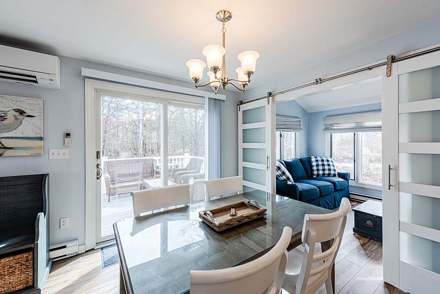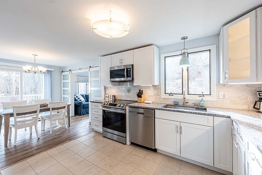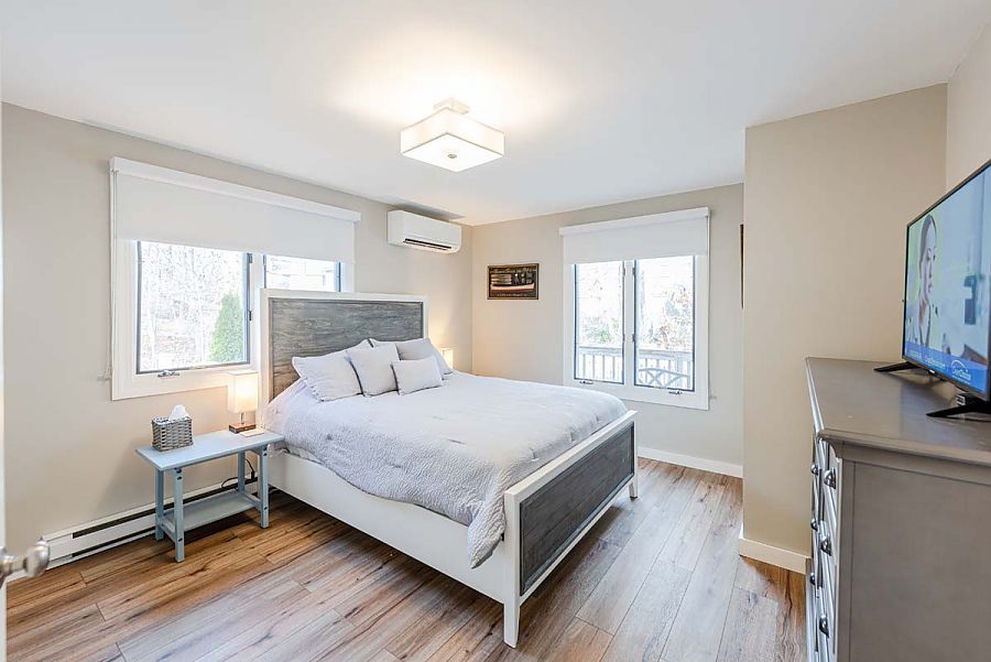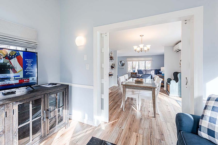 The 1st level hosts the main living area and features a large sectional sofa centered around the media/TV area and is open to the modern, spacious kitchen and dining areas. Additional living space can be found in the TV room just off of the main living area. The TV room can be private or open to the main living area as modern barn doors with glass panels slide to close off the room when a little separation is needed.  Air conditioning mini-split units with individual controls throughout the house assure that all will be kept cool on warm days