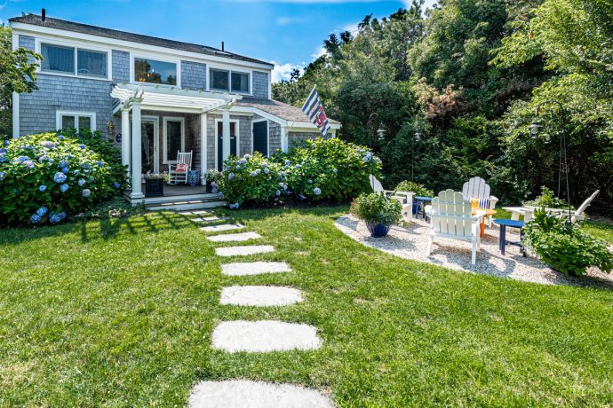 Katama Area, Stylish Designer Luxury, Bike to South Beach and Village Areas, Spacious Bluestone Patio overlooks Private Yard Area
